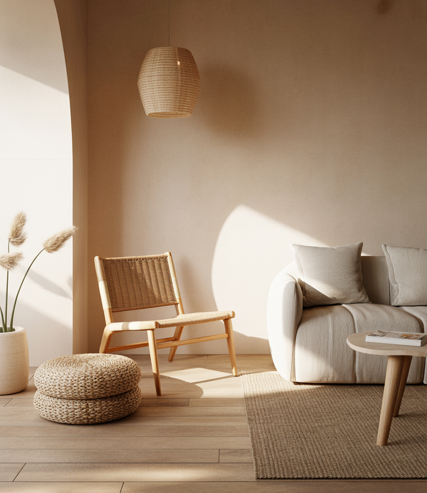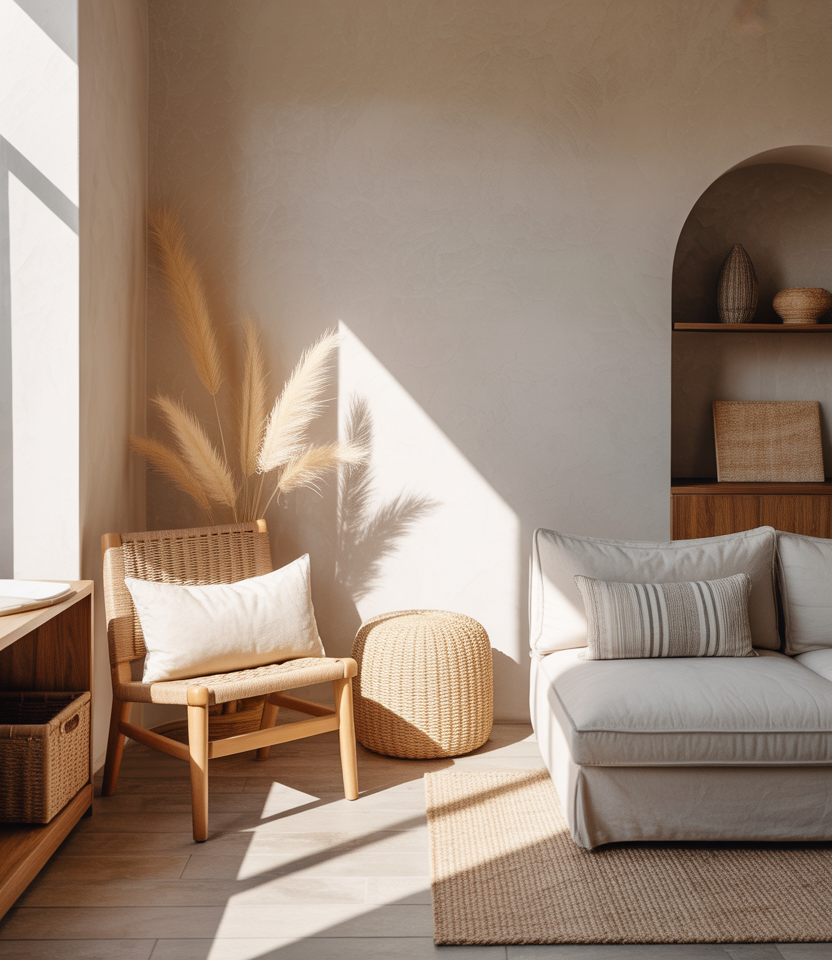 Natural fibers amplify the relaxed feeling of a neutral living room. Think woven chairs, jute poufs, or raffia trays adding dimension without visual noise. Blending organic textures with muted gray tones and touches of brown warmth keeps the palette grounded and timeless.
