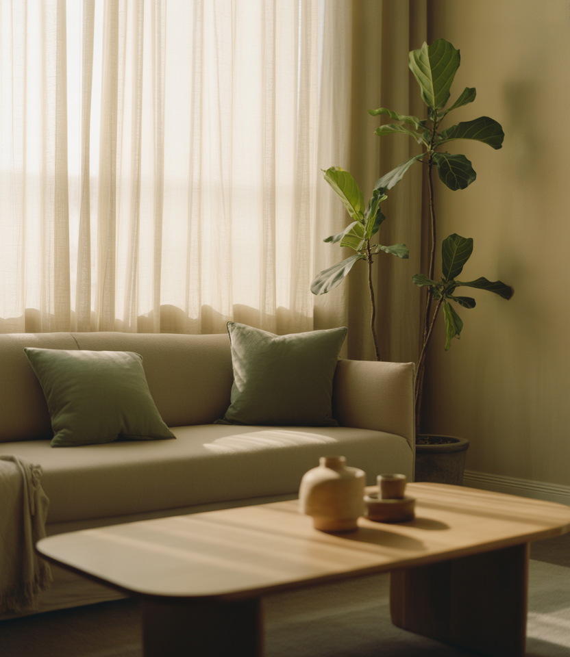 In a neutral living room, the rug often becomes the quiet anchor. A textured weave or understated pattern can shape the entire mood. Pairing a tactile rug with subtle green elements and a few black accents creates an elegant visual base that ties the room together effortlessly.