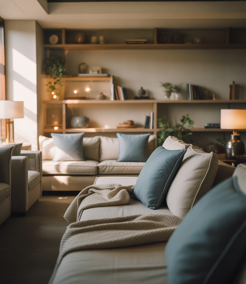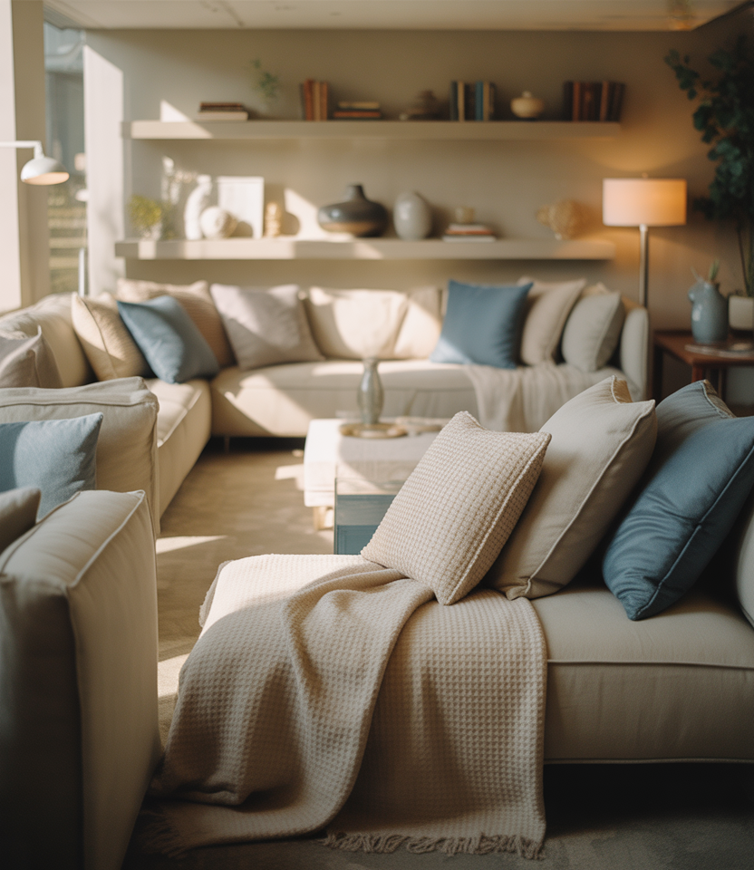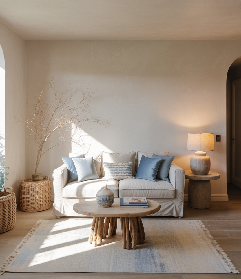 Blue works beautifully inside a neutral living room because it introduces color without feeling loud. Dusty or coastal-inspired tones blend softly with creams and greys. Strategically placed blue accents pair well with sandy hues and a touch of brown grounding, offering clean visual contrast while staying serene.