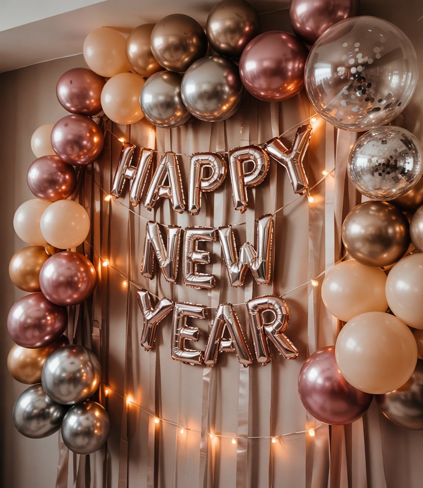 For those who love diy crafts, confetti balloons are an easy and festive way to decorate. Fill transparent balloons with gold, silver, or colorful confetti, then cluster them in corners or above the table. This homemade idea instantly sets the mood for celebration and works well for both Ideas home nye party or gatherings with friends. They’re also budget-friendly—perfect for a Dollar tree run.