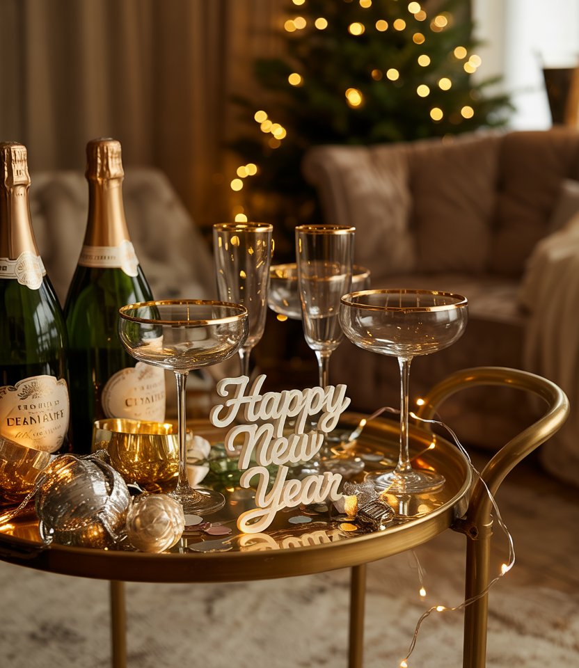 A bar cart can double as décor with some aesthetic styling. Add champagne bottles, gold-rimmed glasses, confetti, and mini LED lights to make it the star of the night. This Ideas diy simple project not only serves drinks but also creates a party focal point in your home. Lifestyle bloggers like The Everygirl often feature styled bar carts as the ultimate detail for a glamorous New Year’s Eve.