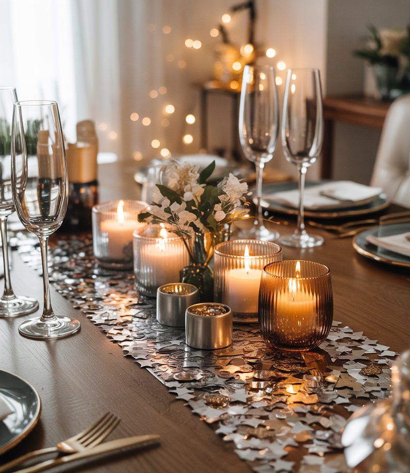 Instead of a fabric runner, try a strip of sequins or confetti along the center of your table. This Ideas diy simple décor is inexpensive but instantly brightens your New Year’s dinner. Mix metallic tones for a bold, aesthetic effect, or keep it minimal with one shade for a minimalist vibe. Experts at Martha Stewart Living suggest layering candles along the runner for extra glow.