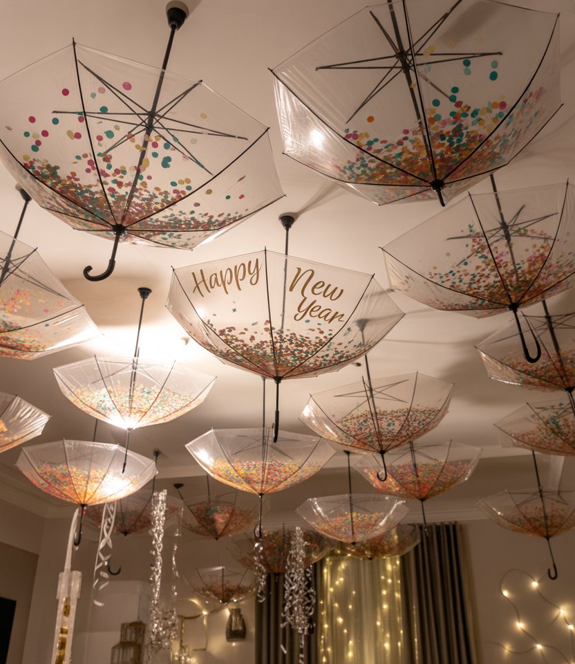 Turn clear umbrellas upside down, fill them with confetti or balloons, and hang them from the ceiling for playful new year’s decorations. This idea works indoors for dramatic flair at an Ideas home nye party or outdoors under a covered patio. Bloggers highlight this as one of the most fun and aesthetic décor trends—unexpected, whimsical, and perfect for kids too.