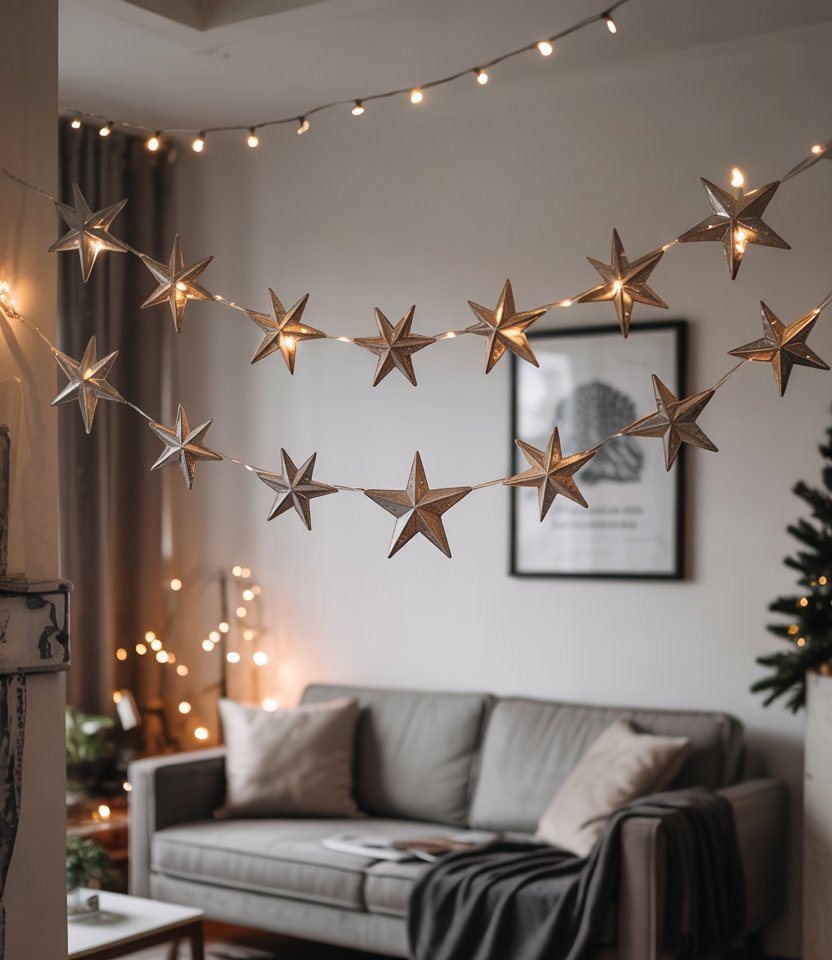 One of the most aesthetic new year’s decorations is a wall garland made from metallic paper stars or circles. String them across the living room or dining area for a playful yet chic effect. This diy project is simple but stylish, and it makes a big visual impact during your Ideas home nye party. Many design experts suggest adding subtle fairy lights for sparkle—an easy way to make the wall a focal point.