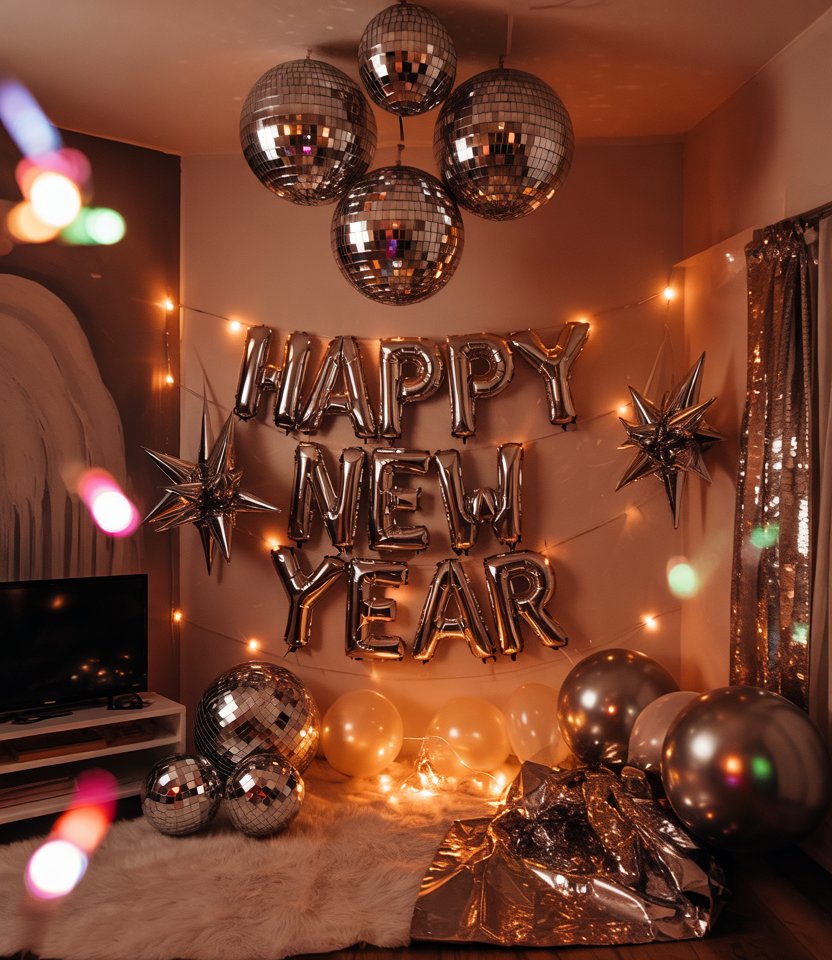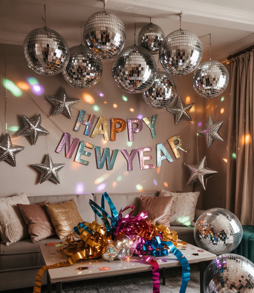For a party that’s bold and fun, take a trip to Dollar tree for mirrors, glitter paper, and disco balls. Transform your living room into a sparkling dance floor—proof that new year’s decorations don’t need to be expensive. With easy Ideas diy simple, you can hang disco ornaments from the ceiling or scatter shiny décor across the table. Bloggers love this for its mix of affordability and wow factor.