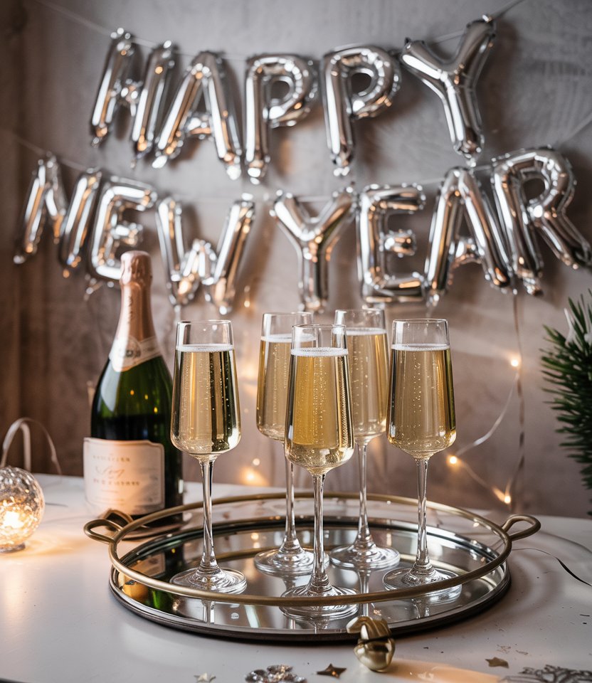 Every celebration feels complete with champagne, and turning it into décor is clever. Create an aesthetic champagne station using mirrored trays, crystal glasses, and metallic balloons above. This Ideas home nye party detail doubles as both functional and festive décor. DIY bloggers recommend adding a chalkboard with playful notes like “Pop, Fizz, Clink.”