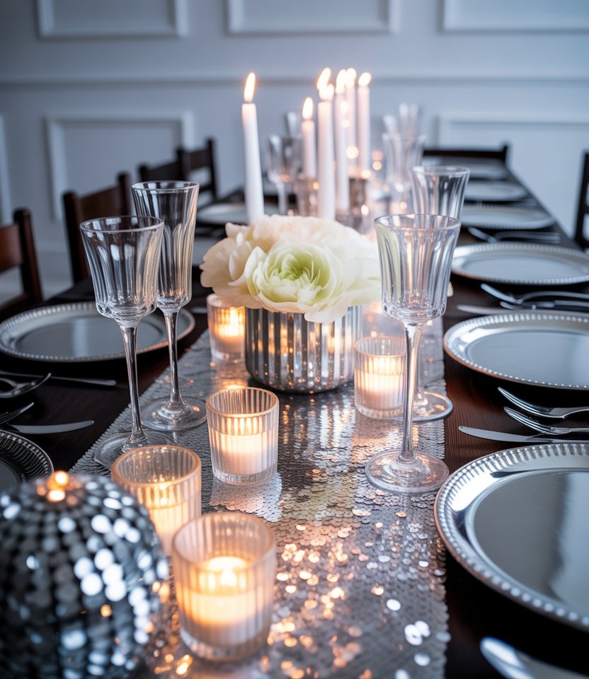 For a simple yet striking setting, a silver palette is a timeless choice. Use sequined runners, mirrored chargers, and crystal glassware to reflect candlelight. This look feels luxe but remains easy to recreate at home. As designer Eddie Ross often notes, layering reflective surfaces adds instant glamour without needing elaborate props. Pair with white flowers or metallic confetti for added brilliance.