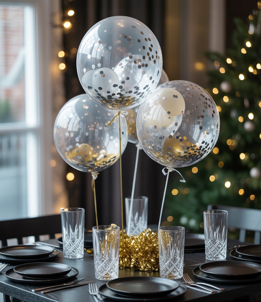 Bring whimsy with a diy balloon garland running the length of the table. Stick to metallic shades like silver, black, and pearl white. It’s surprisingly simple to assemble and doubles as a conversation starter. Stylist Janelle Haskins notes that balloons add vertical drama while staying budget-friendly—making them one of the most easy decorating ideas for New Year’s Eve.