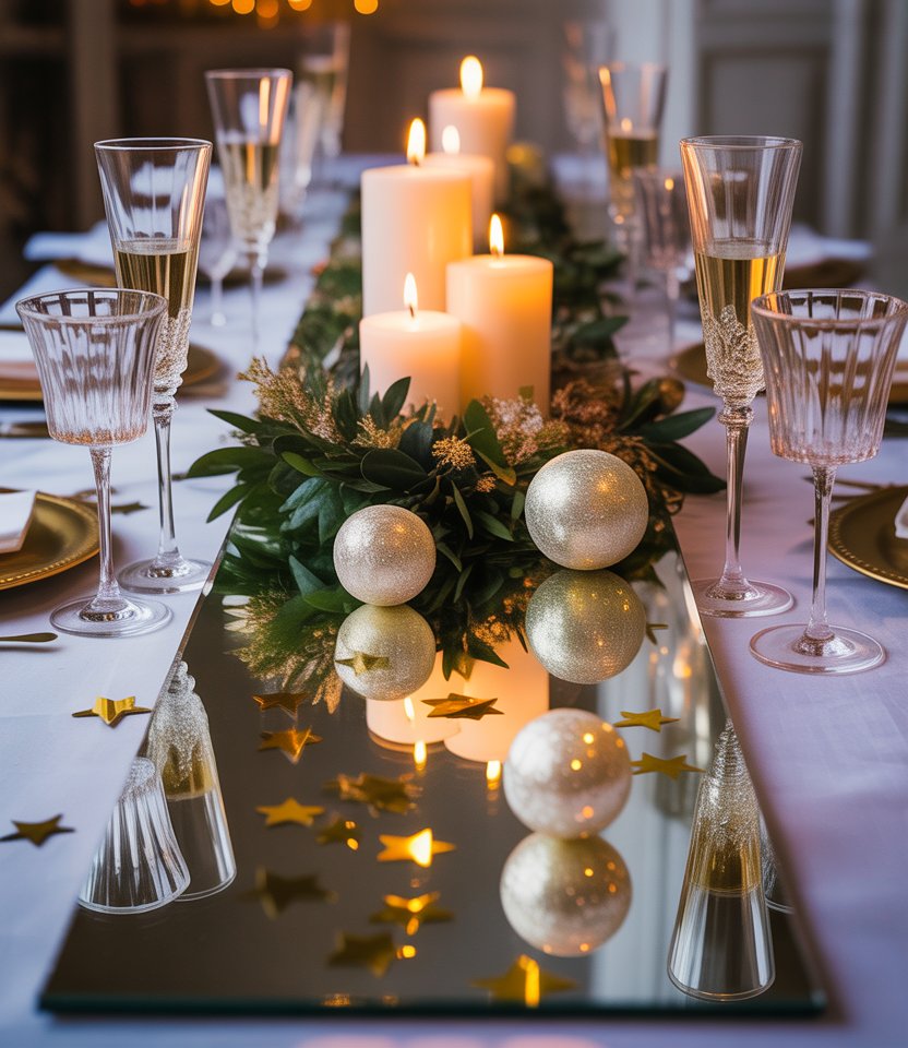 Use mirrored tiles or a long mirror strip as a table runner. The reflection doubles every candle flame, crystal, and centerpiece, instantly amplifying glamour. Design experts note mirrors are one of the most cost-effective decorating ideas to create drama. Keep everything else simple—white dishes, metallic flatware, and greenery—to let the mirror shine. This trick works for both small dinners and large-scale wedding-style parties.