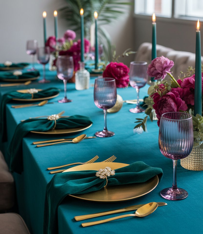 Step away from classic metallics and embrace jewel tones like emerald, sapphire, and amethyst. Velvet napkins, deep-colored glassware, and moody florals create richness that feels different from the expected. Designers at House Beautiful highlight jewel tones as a bold choice for winter gatherings. Add a touch of gold for warmth, and you’ll have a table that feels regal yet festive.