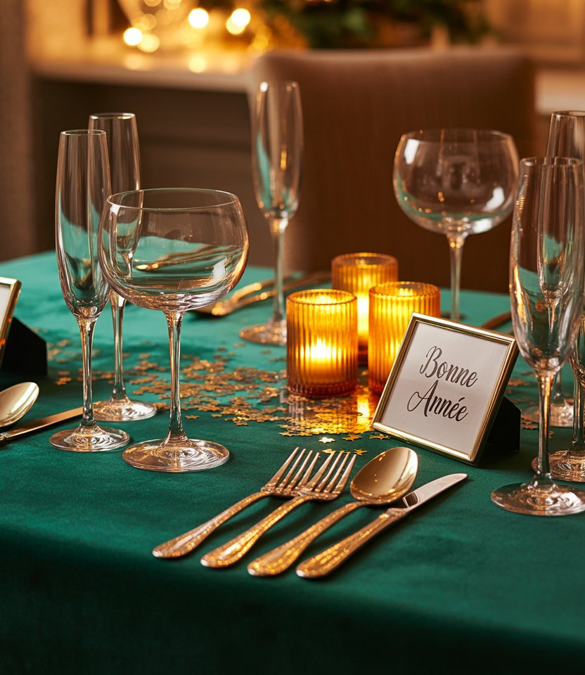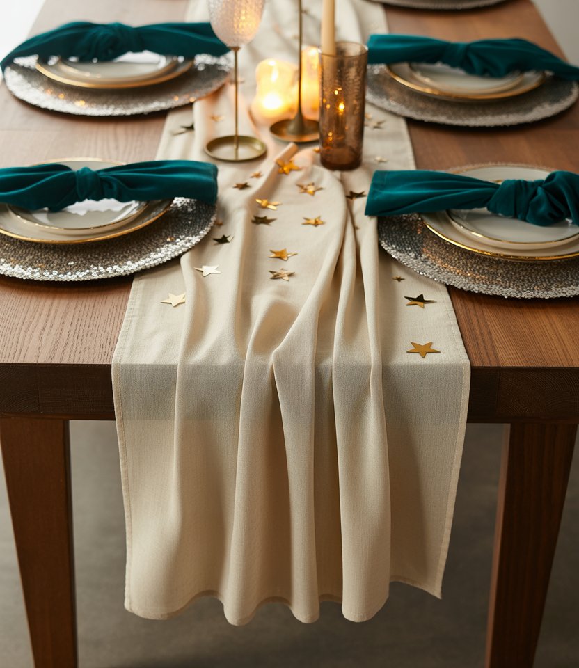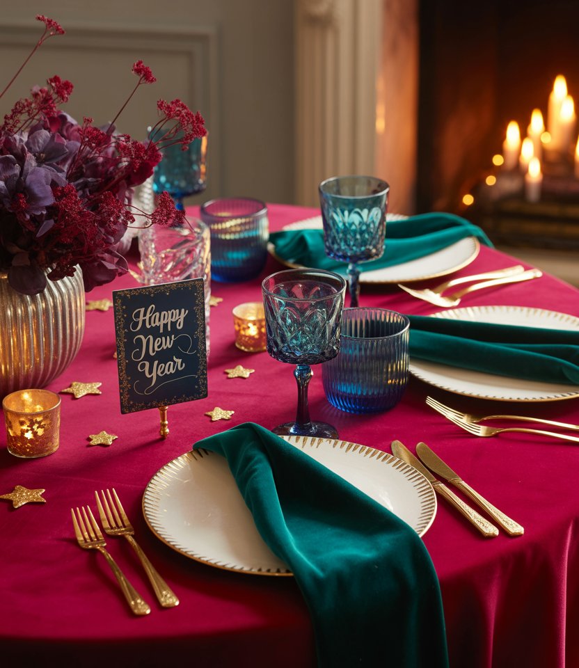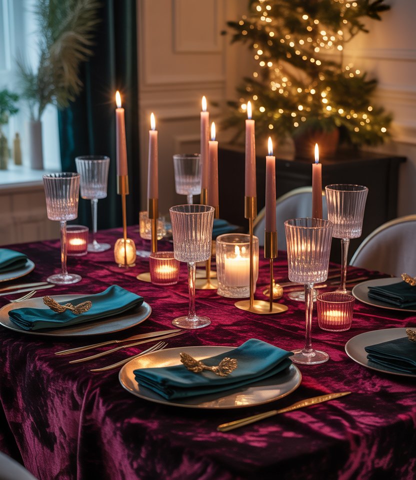 Swap out standard linens for a jewel-toned velvet tablecloth in sapphire or burgundy. Velvet immediately feels upscale, adding softness and depth to the room. As Domino Magazine notes, fabric textures can completely shift a space from casual to glamorous. Pair with crystal stemware and metallic flatware to create contrast. This lush look is perfect for hosting a chic dinner that bridges holiday warmth with New Year’s sparkle.