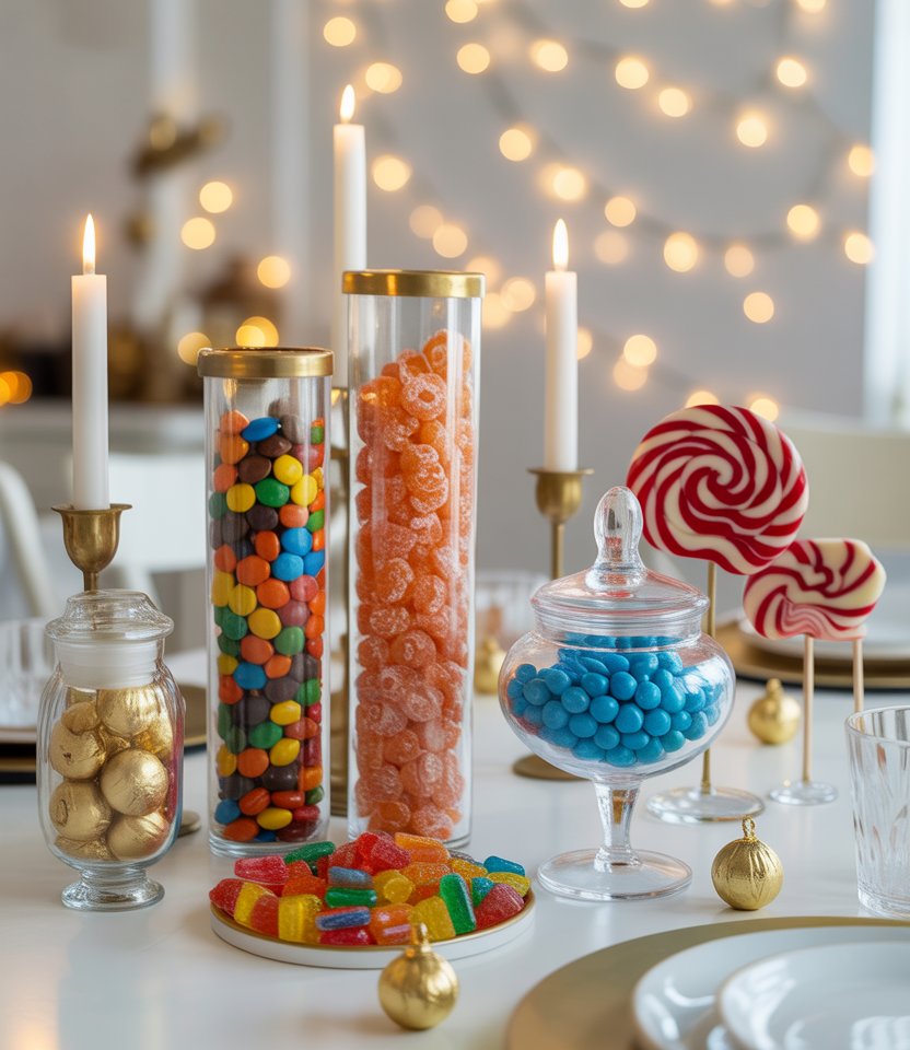 Transform your table into a candy wonderland for kids. Use tall glass jars filled with candy canes, lollipops, or chocolate coins wrapped in gold foil. This doubles as decoration and after-dinner treats. Experts often recommend edible decorations because they add fun without extra clutter. Adults may indulge too, making it a win for everyone. Bright colors make the table pop and keep the mood lively.