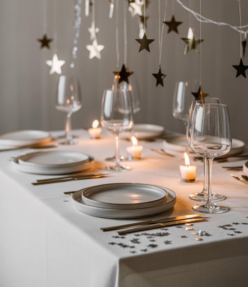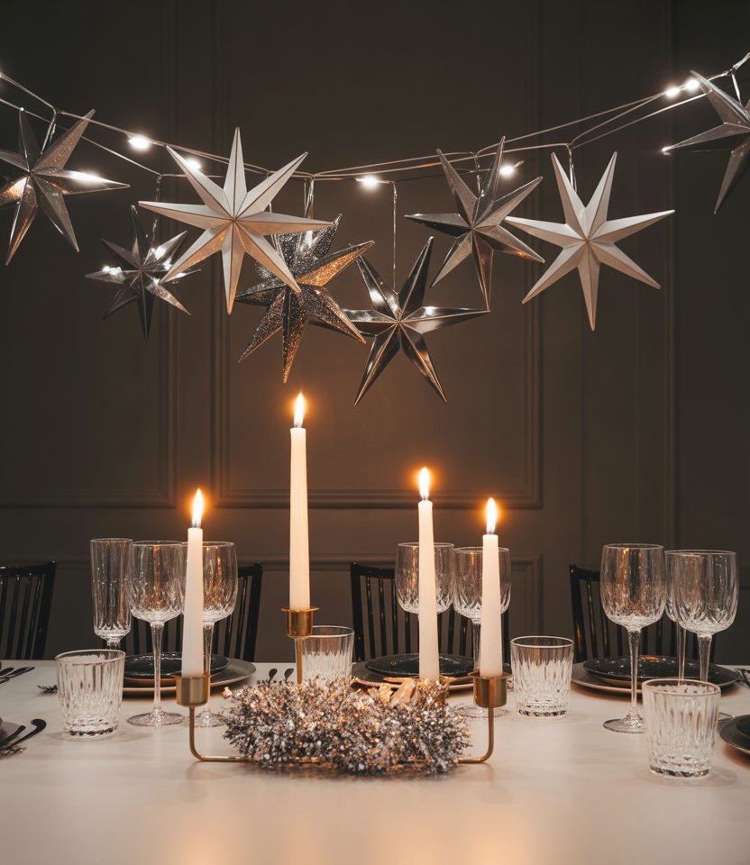 Instead of only decorating the table’s surface, create overhead drama with dangling metallic star garlands. Suspended at different heights, they sparkle with candlelight and catch the eye immediately. According to Domino magazine, layered vertical elements expand the sense of space and add whimsy. Keep the table simple with monochrome plates so the stars feel like the main attraction.