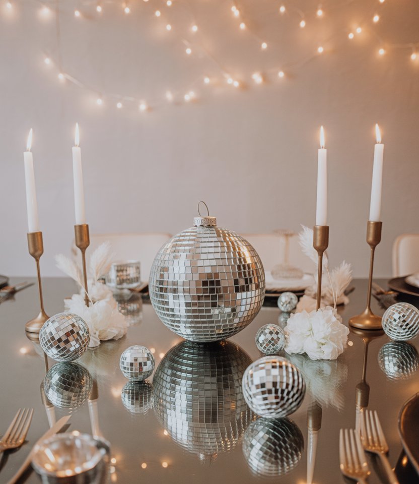 Bring back retro fun with a silver disco ball placed at the table’s center. Pair it with mini disco ornaments scattered along the runner. This nod to the ’70s makes the table dynamic, especially when light bounces across the room. Event stylists often recommend disco balls for lively parties because they blend décor with entertainment. Add white flowers for contrast to soften the shine.