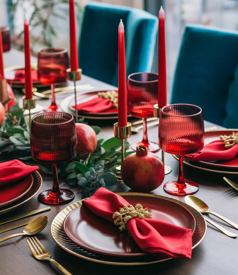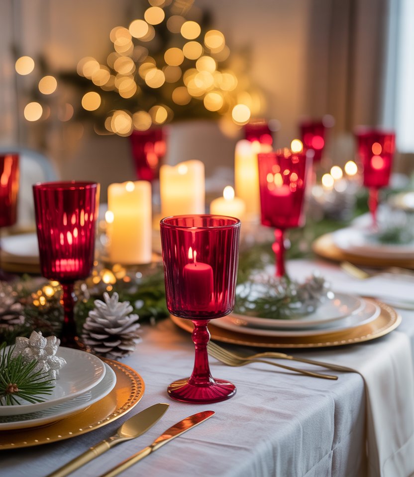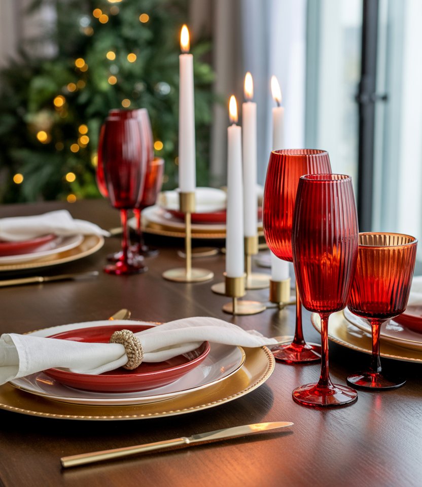 Instead of traditional clear stemware, opt for red or ruby-colored glasses. This bold move makes even a neutral table feel festive and chic. Elle Décor highlights how colorful glassware can act as both functional and decorative. Balance the intensity with gold chargers and crisp white linens. This setup works equally well for family gatherings or glamorous dinner parties.
