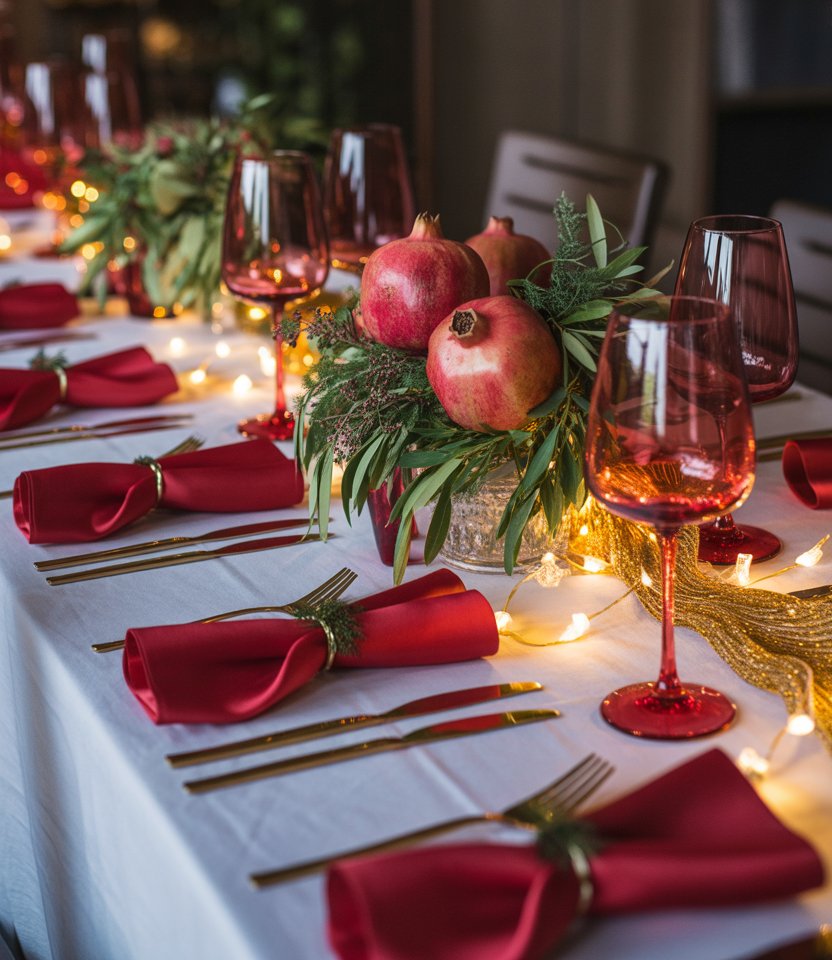 Adding red brings passion and drama to your table, perfect for ringing in the new year. Think red napkins tied with gold ribbon, ruby glassware, or even a bowl of pomegranates as a centerpiece. According to Elle Décor’s editors, this vibrant shade naturally sparks conversation. It’s one of those ideas decorations that feels festive for both adults and kids, yet versatile enough for January dinners afterward.
