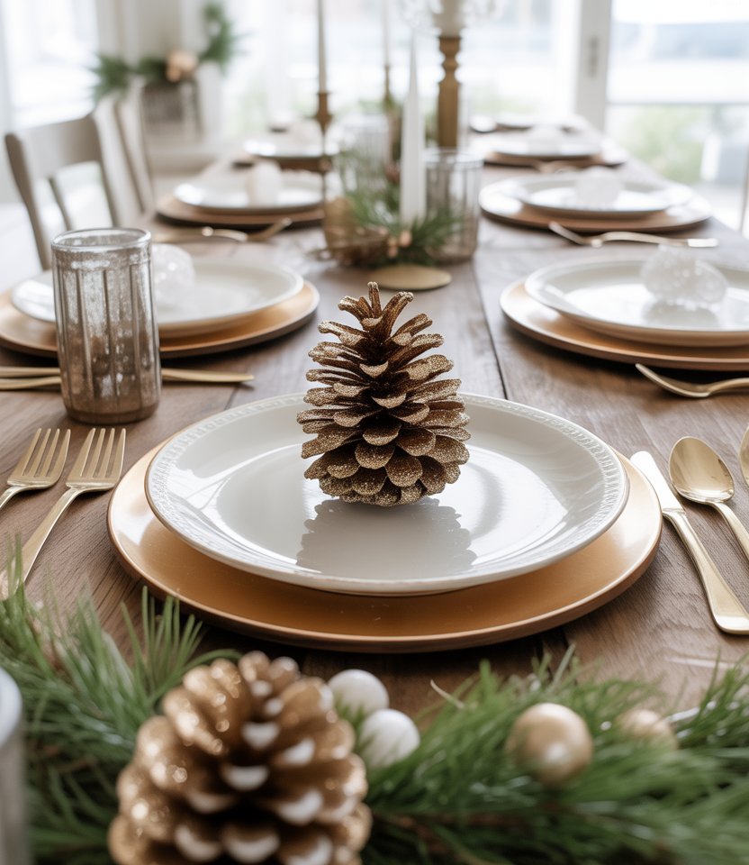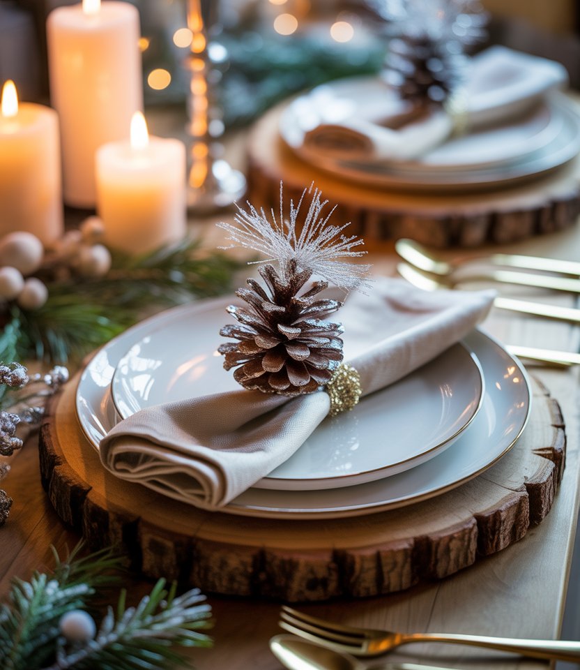 Bring natural charm indoors with pinecones dipped in silver or gold glitter, clustered as a centerpiece or used as napkin holders. It’s an easy diy project that blends rustic coziness with festive sparkle. Better Homes & Gardens praises natural elements as timeless winter staples. Pair with white dishes and wood chargers to balance glam with earthiness. Guests love this touch because it feels personal and handcrafted.