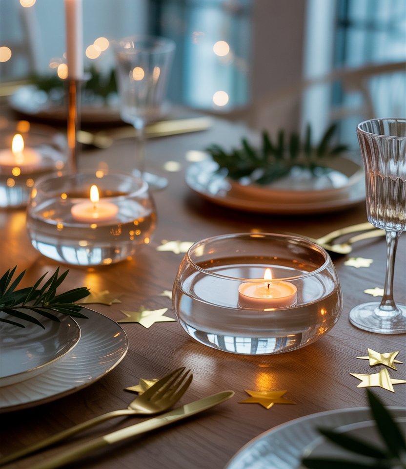 Instead of traditional candlesticks, place floating candles in shallow glass bowls filled with water and gold star confetti. The reflection adds dimension, making your table glow. Designers often suggest water elements for modern, simple decorating ideas that feel innovative. This centerpiece doubles as a conversation starter while keeping the overall table uncluttered. Add citrus slices or flowers for variation.