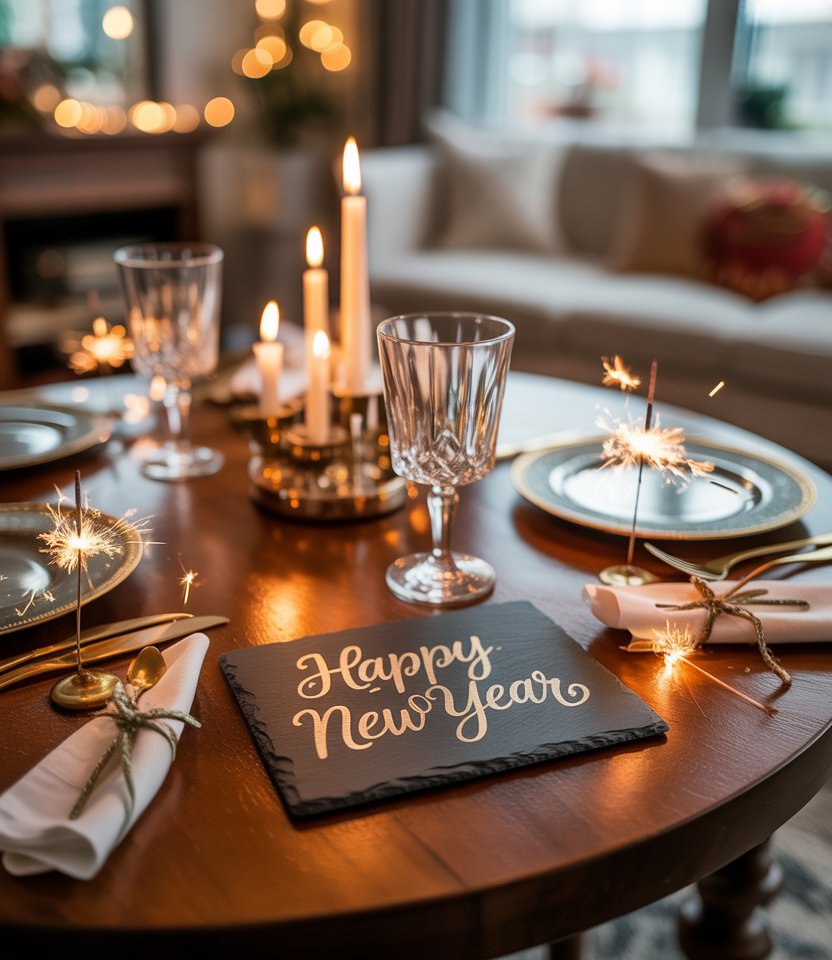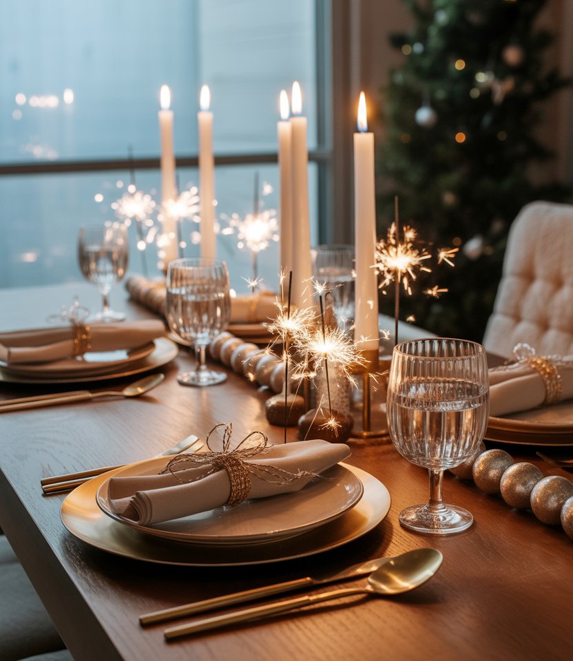 Place mini sparklers at each setting, tied with ribbon to napkins. At midnight, guests light them together, turning the table into a spectacle. Event planners love interactive decorations like this, saying they create magical shared moments. Ensure safety by providing small holders or bowls for ash. This idea makes the countdown unforgettable and keeps the focus on celebration.