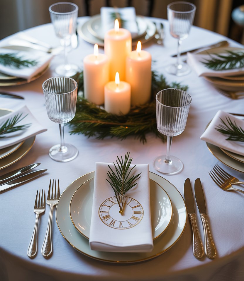 Fold napkins into clock shapes or use printed napkins featuring midnight motifs. This symbolic touch connects directly with the countdown theme. According to PartySlate, thematic decorations instantly create storytelling moments at gatherings. Combine with sleek metallic holders and simple dishes so the napkins become the focal point. It’s clever, playful, and very on-theme.