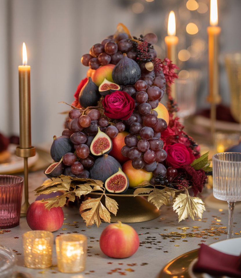 Mix bowls of grapes, figs, and pears with winter florals like roses or orchids for a lush centerpiece. This Mediterranean-inspired idea ties abundance to New Year traditions of prosperity. Food stylist Athena Calderone often recommends merging edible elements with florals for dynamic displays. Add gold spray-painted leaves for sparkle and dimension.