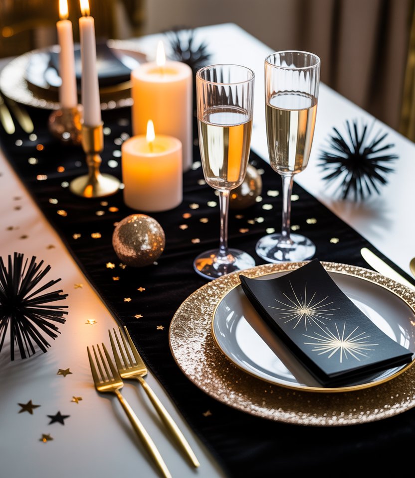 Few decorations say New Year’s like black paired with gold. A black velvet runner topped with gold flatware and glittering chargers makes the table shimmer. This easy formula never fails, especially with champagne flutes at the ready. Designers from Architectural Digest recommend using matte black elements to balance metallic shine, creating sophistication without overwhelming the senses.