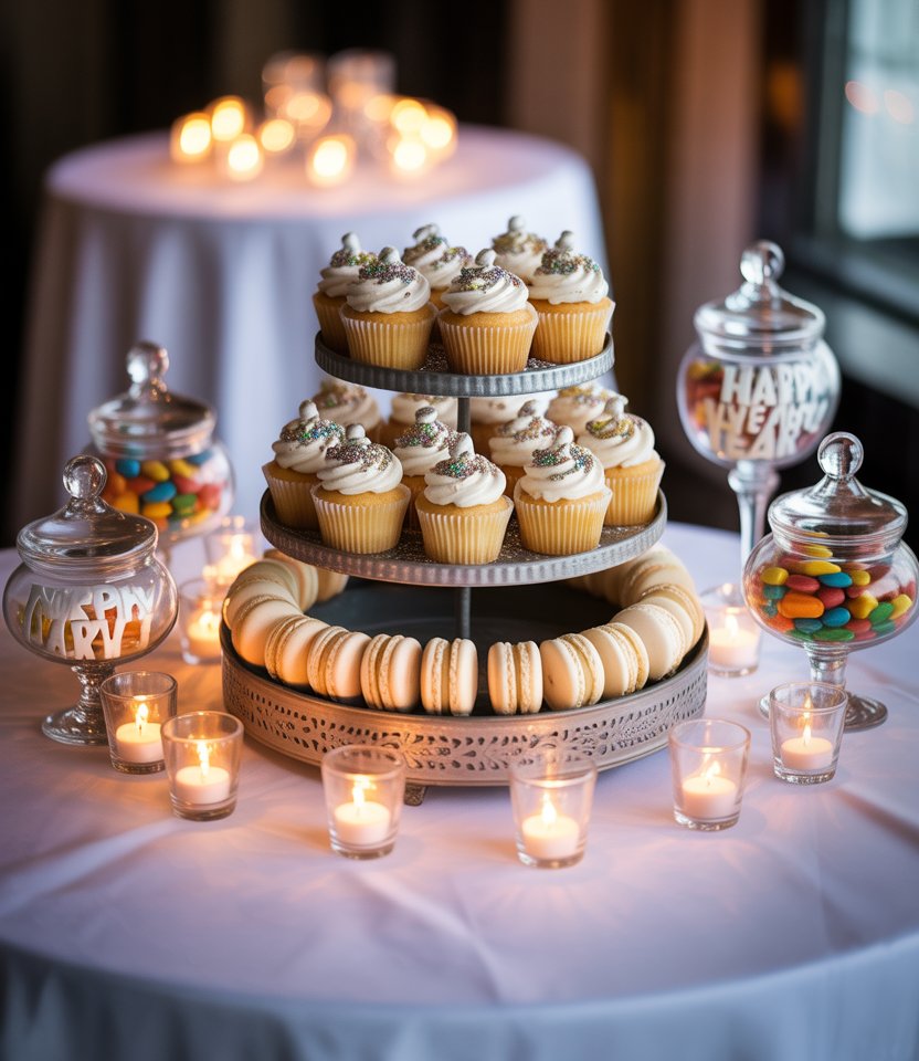 Instead of one centerpiece, scatter mini dessert stands along the table. Cupcakes topped with glitter sprinkles, macarons in silver boxes, or candy jars double as décor. It’s a simple way to merge ideas decorations with edible treats. Event planners often say food is the most photographed part of any party—so why not make it part of the decorations themselves?