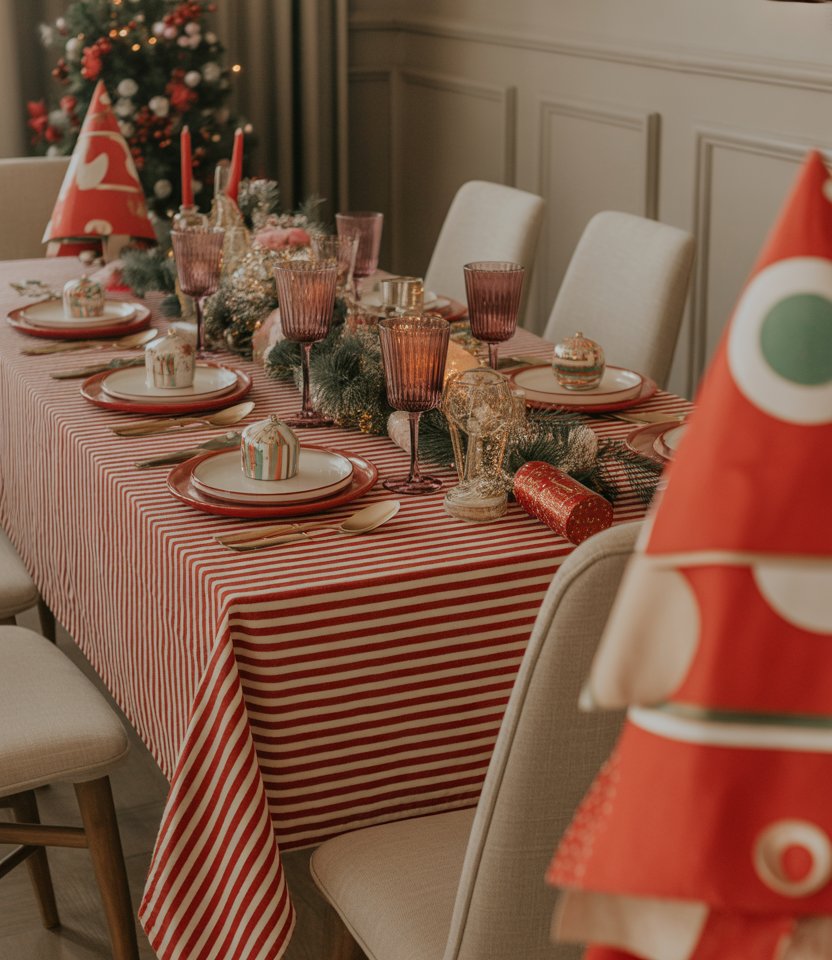 For a playful twist, swap neutral linens for red and white striped runners or napkins. It’s a nod to classic holiday vibes but reimagined for New Year’s. Style expert Sabrina Soto suggests mixing bold patterns with metallic accents for balance. Add simple diy touches like painted jars with white candles to make it approachable yet striking. This setup works well for both adult dinners and family-friendly celebrations with kids.