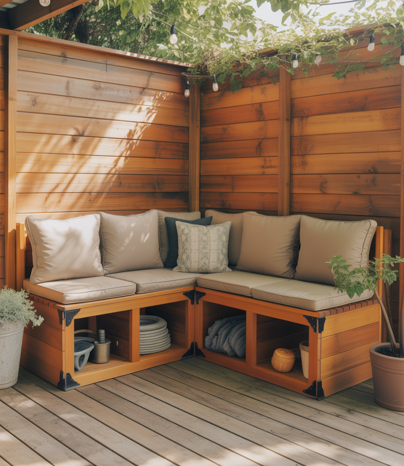 Smart storage keeps patios tidy, especially in small spaces with fire pit areas where blankets and tools need a home. Benches with hidden compartments or narrow deck boxes help renters and homeowners alike stay organized. A neighbor built a DIY bench from reclaimed lumber, creating a rustic but practical solution that blended seamlessly into their seating arrangement while keeping clutter out of sight.