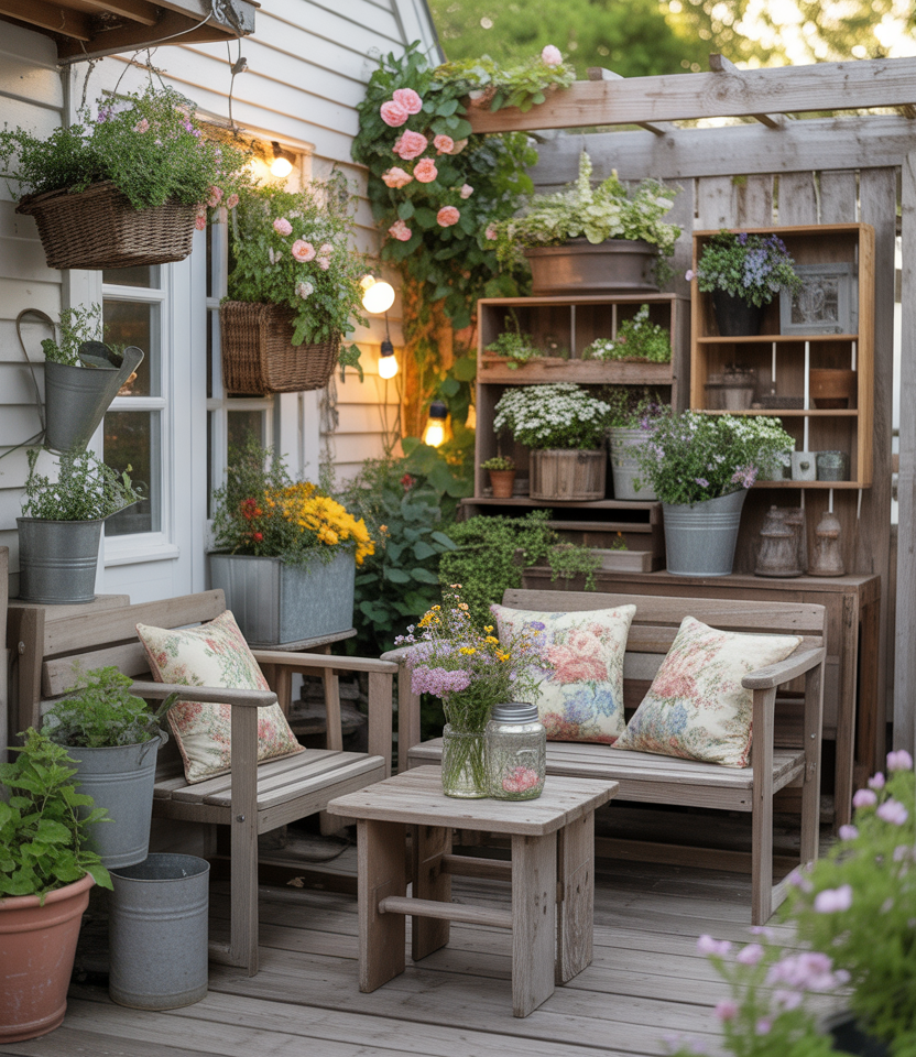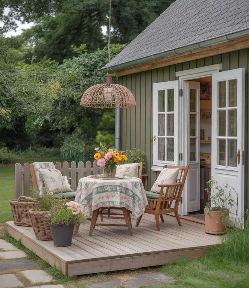Soft florals, natural wood, and vintage décor define the country cottage-core patio look. It thrives in backyards and small spaces, where textured fabrics and collected objects add charm on a budget. A friend layered lace runners, woven baskets, and enamel pitchers, creating a slice of countryside comfort in the middle of a city apartment courtyard.