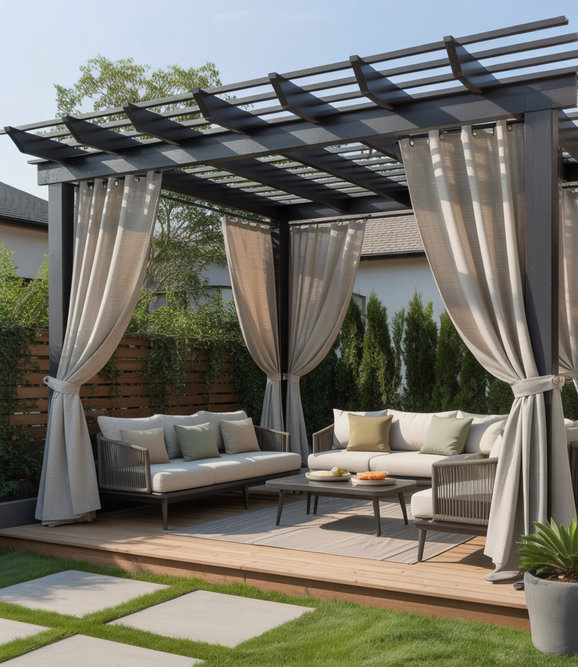 A covered patio instantly elevates comfort, offering sun protection and year-round usability. Whether using retractable awnings or polycarbonate panels, this idea blends form and function for small spaces, modern homes, and large suburban decks alike. A family member of mine installed a pergola with simple curtains, turning their once harsh, exposed patio into a breezy retreat that feels surprisingly resort-like.