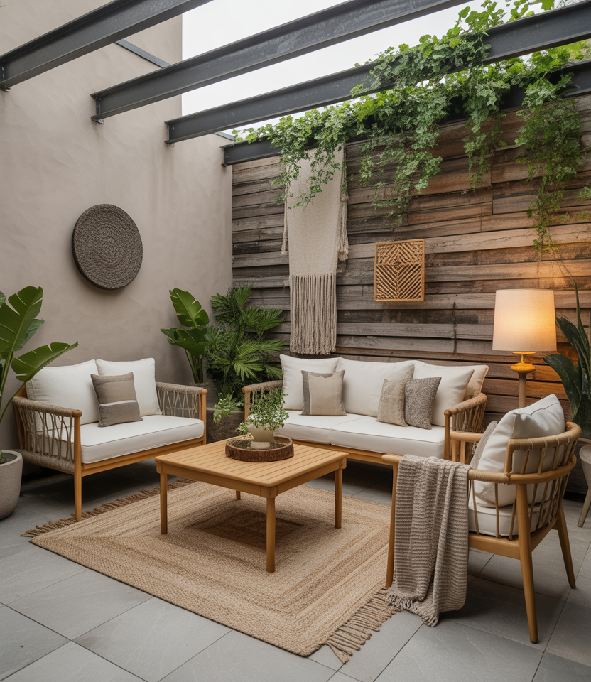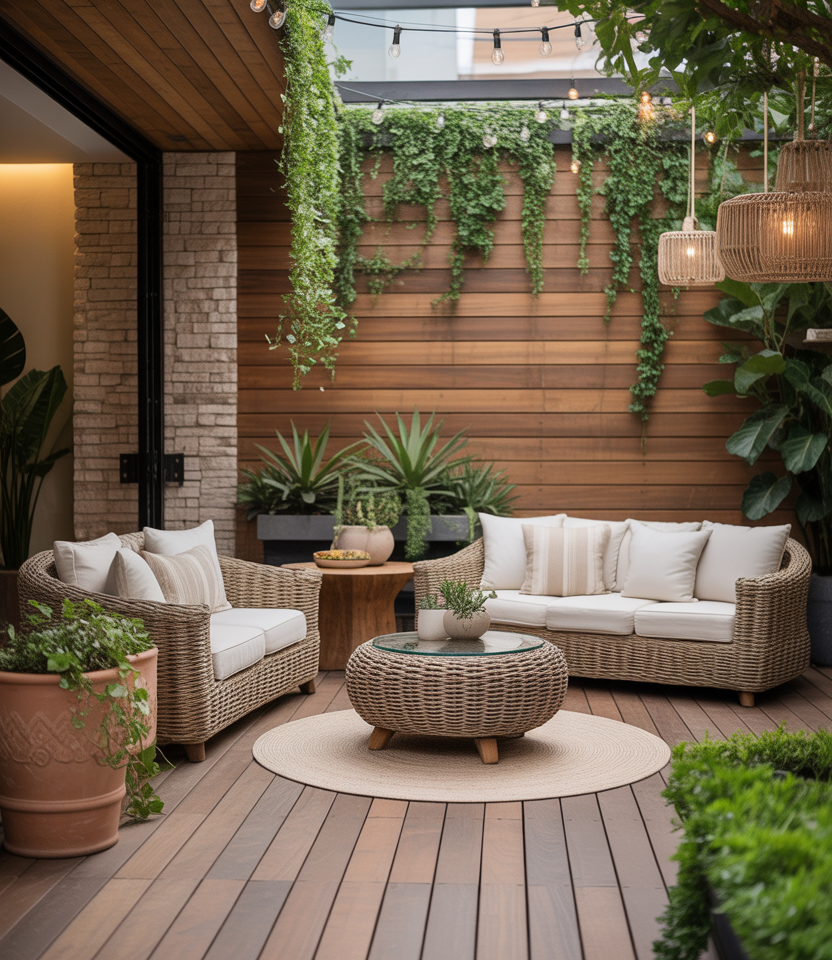 Mixing wood, stone, textiles, and greenery creates depth without clutter. This layered look suits tiny patios, large decks, and rustic or Mediterranean themes alike. Fabric throws, woven rugs, and warm-toned planters tie everything together. A designer once told me that texture is the secret ingredient that makes even cheap décor appear intentionally curated.