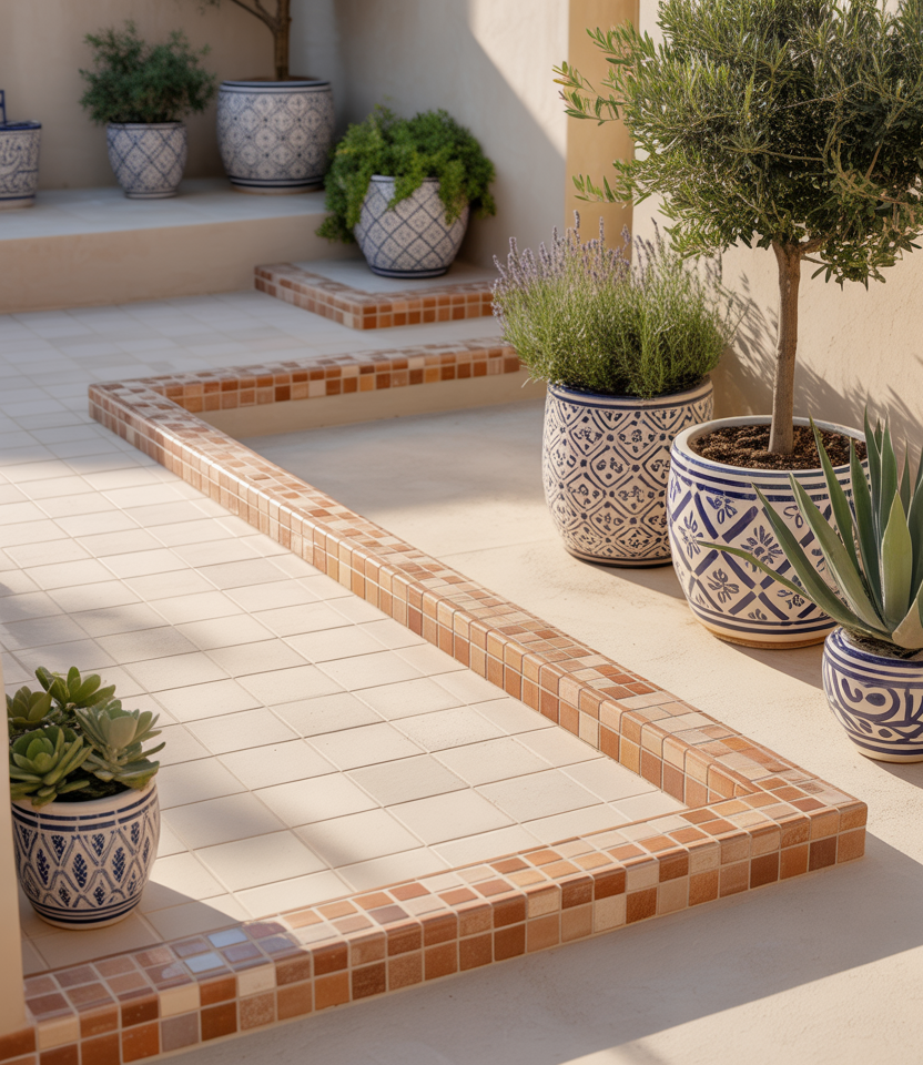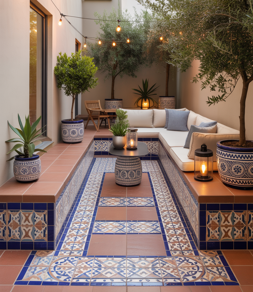 Decorative tile borders instantly enhance patios while staying relatively cheap and renter-friendly. Whether Mediterranean-inspired or clean-lined modern, tiles visually separate lounging areas from dining or kitchen zones. I once watched a couple frame their small concrete pad with patterned porcelain tile, transforming what felt like dead space into a polished, design-forward small-space modern layout.