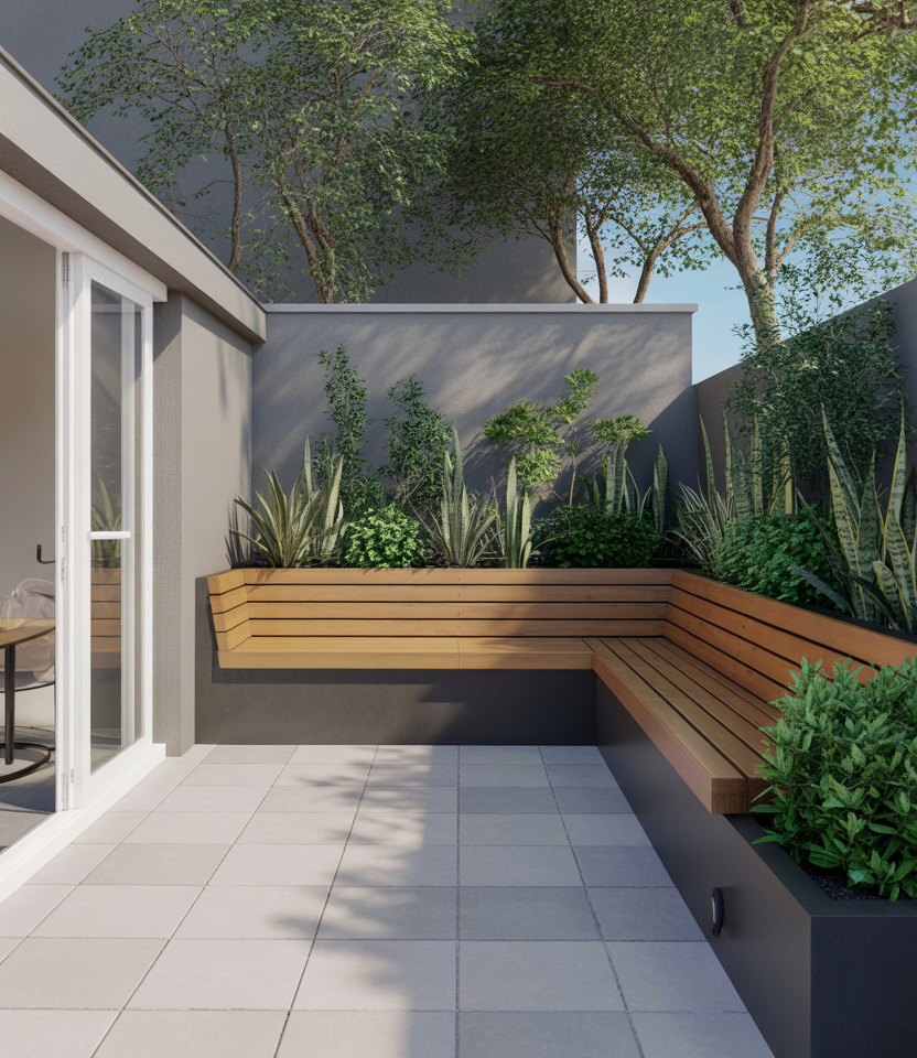 Planter seating walls combine structure and greenery into a single footprint—ideal for small spaces, tiny patios, or minimalist simple backyards. They act as benches while hosting flowers or herbs. I saw a builder create a compact L-shaped planter seat that added both storage and personality, proving that smart construction can replace bulky furniture while elevating the entire patio experience.