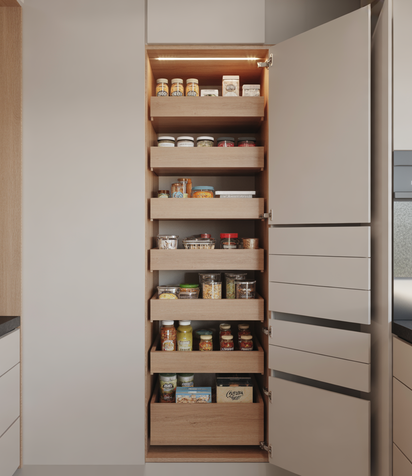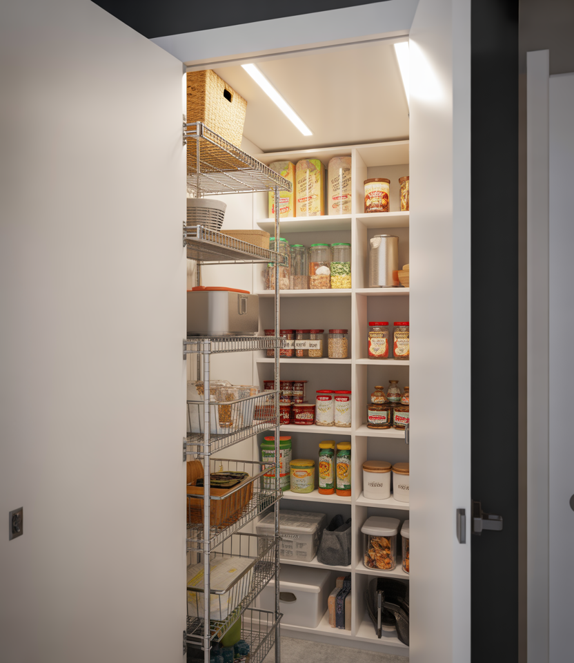 A concealed pantry built behind full-height cabinetry is a dream solution for a small kitchen or narrow layout. This idea blends seamlessly into the kitchen, creating an aesthetic and clutter-free look while keeping daily food essentials tucked away. Designers often pair this arrangement with pull-out racks or slim IKEA shelves to maximize the surprise factor. It’s a clever way to expand storage without changing the footprint.