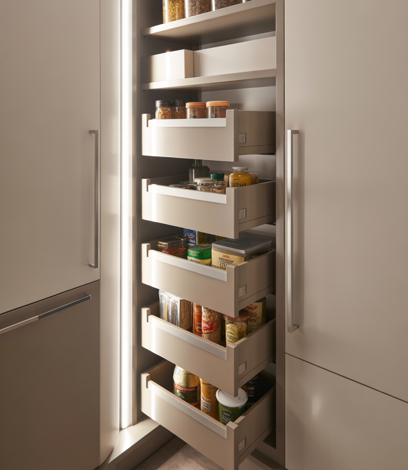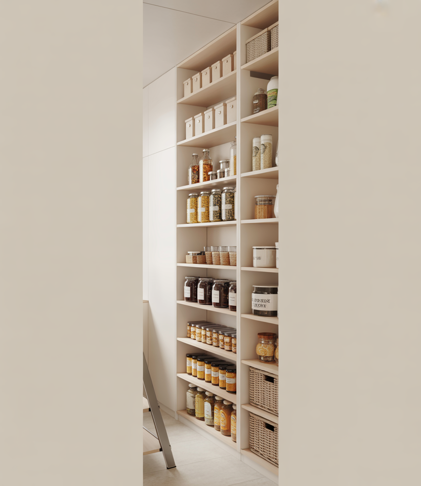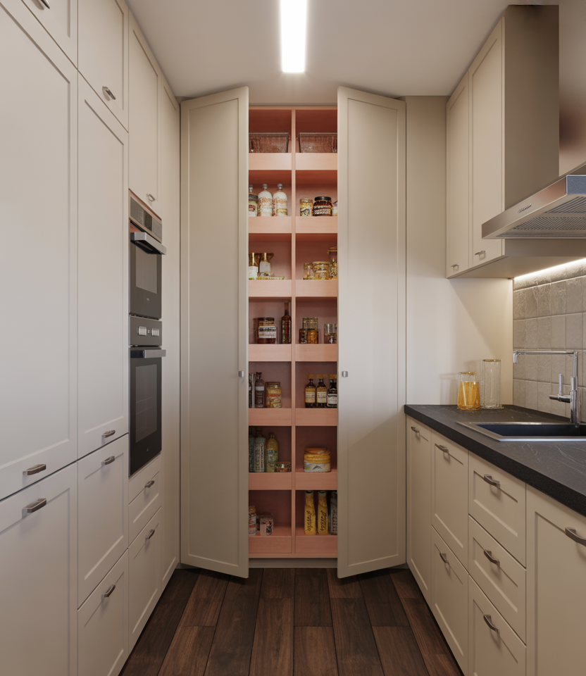 A concealed pantry built behind full-height cabinetry is a dream solution for a small kitchen or narrow layout. This idea blends seamlessly into the kitchen, creating an aesthetic and clutter-free look while keeping daily food essentials tucked away. Designers often pair this arrangement with pull-out racks or slim IKEA shelves to maximize the surprise factor. It’s a clever way to expand storage without changing the footprint.