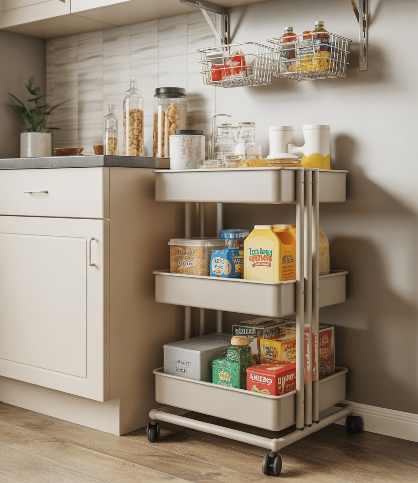A rolling cart works beautifully in a small space, especially where a full pantry doesn’t exist. My neighbor uses one between her kitchen and bathroom, stocked with snack items and everyday food staples. It’s a realistic and affordable idea using Dollar Tree organizers or Ikea inserts, making the cart feel custom. This is perfect for renters who need flexible ideas for small kitchens without drilling into walls.