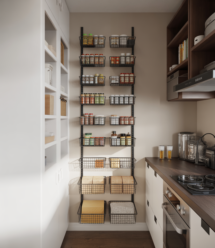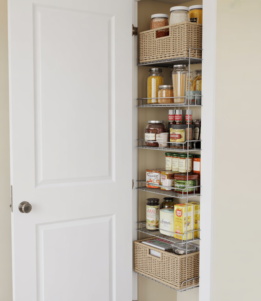 Over-the-door units offer instant space in a closet, walk-in pantry, or even a converted bathroom pantry nook. These systems feel incredibly realistic for busy households needing quick food access. I’ve seen decorators pair them with matching baskets or slim IKEA shelves for a more aesthetic appearance. This is especially useful in narrow spaces where every inch matters.