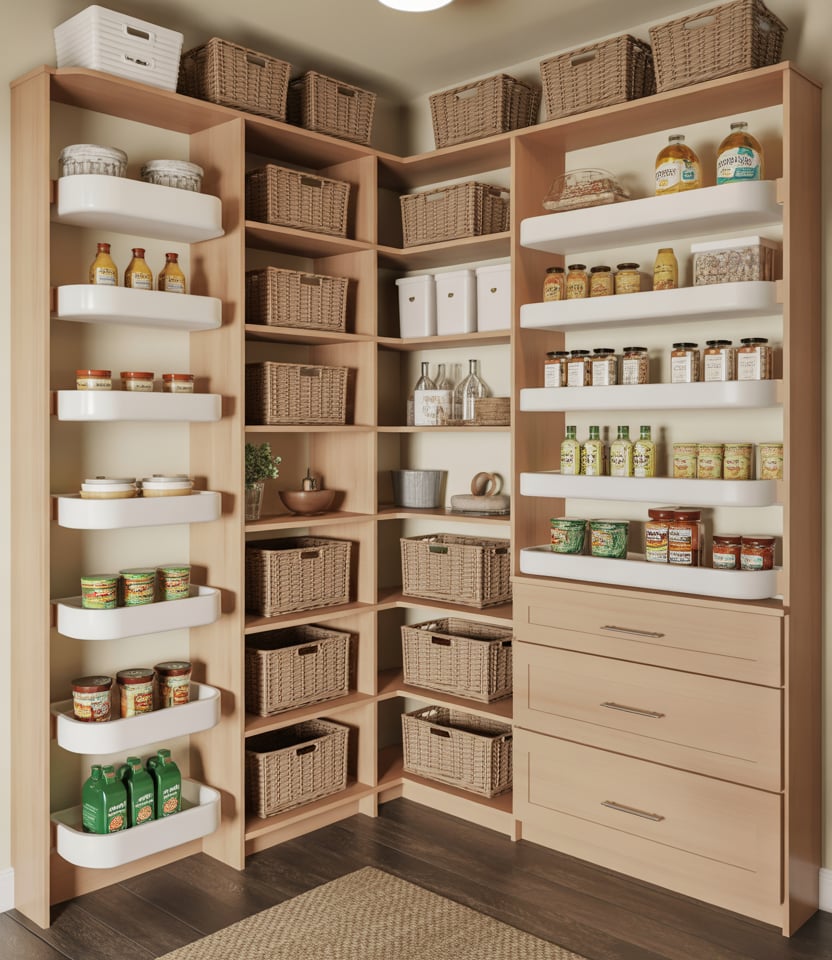Lazy Susans are lifesavers in awkward kitchen corners or deep walk-in pantries. They make food categories easy to reach and keep the aesthetic neat. I once added one to a friend’s closet pantry, and she couldn’t believe she had ignored the idea. Paired with Dollar Tree containers or wooden baskets, they create a realistic but stylish solution for those hard-to-use angles.