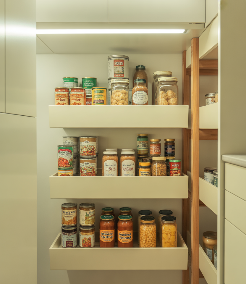 Tiered risers make a huge difference in a small space or narrow pantry by elevating canned food to eye level. Many decorators recommend risers from Ikea or Kmart to keep labels visible and the look aesthetic. This idea shines in Ideas for Small Kitchens, where maximizing visibility reduces waste and overbuying. I use them in my own kitchen, and they instantly made my shelves feel intentional.
