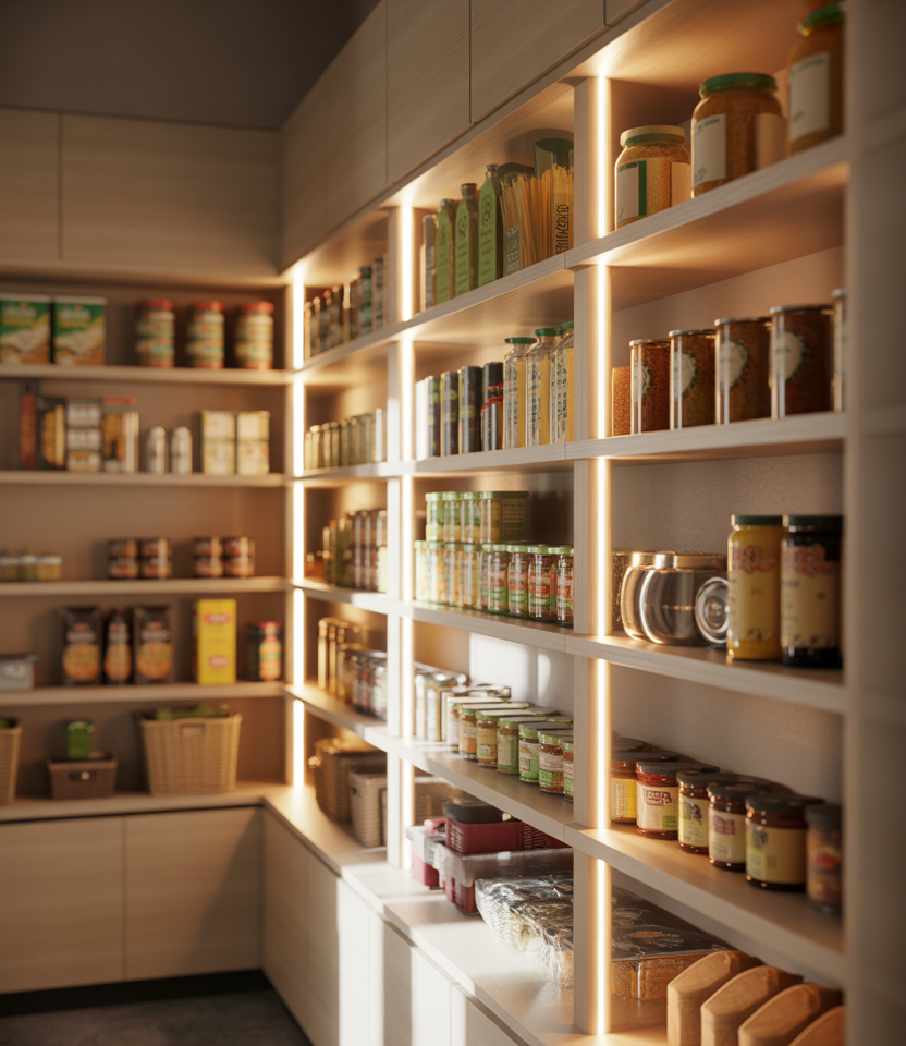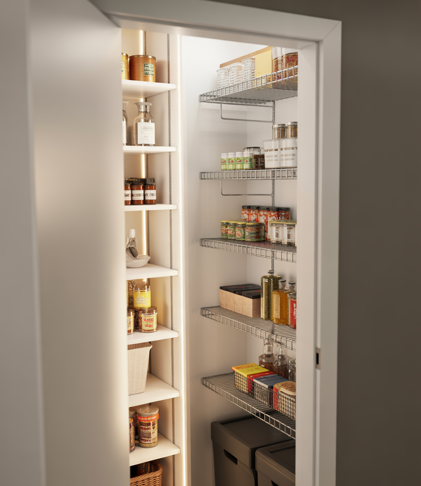 Good lighting transforms any kitchen or closet pantry into an inviting, aesthetic space. I once installed motion LED strips—just a DIY project—and it changed how I interact with my food storage. Whether in a small space or large pantry, lighting highlights IKEA shelves and keeps the area feeling fresh and realistic. Even Dollar Tree puck lights can work wonders.