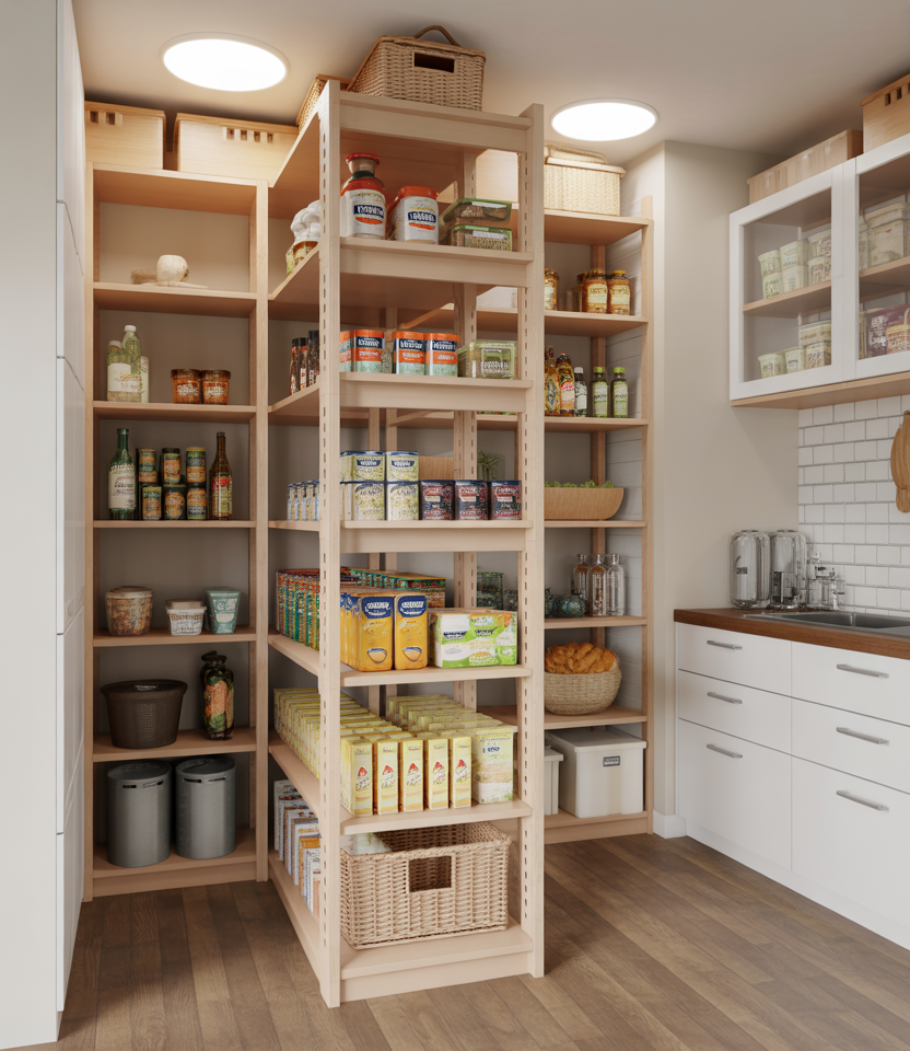 For large families, customizable modular pieces—from Ikea to Kmart—help build a tailored kitchen setup. I saw this firsthand in a friend’s walk-in pantry, where labeled zones kept food rotation clear and stress-free. Using IKEA shelves and stackable bins brings structure to big spaces while maintaining a realistic layout you can actually maintain.