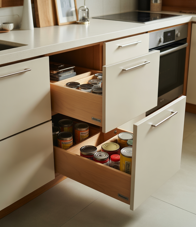 Toe-kick drawers turn the base of your kitchen cabinets into clever storage, perfect for small-space homes with limited pantry capacity. This DIY upgrade works well for lesser-used food items or backup snacks, keeping the main area uncluttered. It’s an aesthetic solution I discovered from a cabinet maker who said homeowners regularly forget the potential under their feet—especially helpful for ideas for small kitchens.
