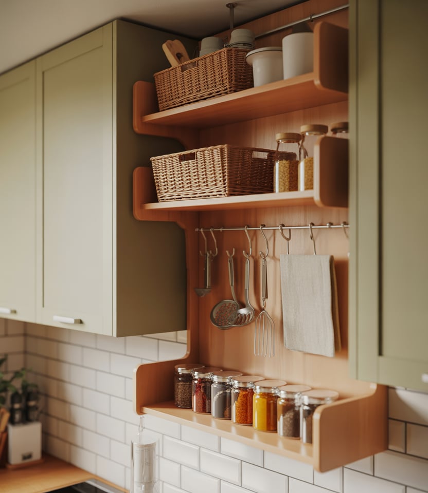 A slim, sliding spice wall fits perfectly between appliances in a small kitchen or beside a closet pantry. It’s a DIY-friendly project that feels unexpectedly aesthetic, especially when filled with matching jars. This realistic solution keeps food seasonings accessible without cluttering countertops. I copied this idea from a designer who swears by it for tight, narrow homes.