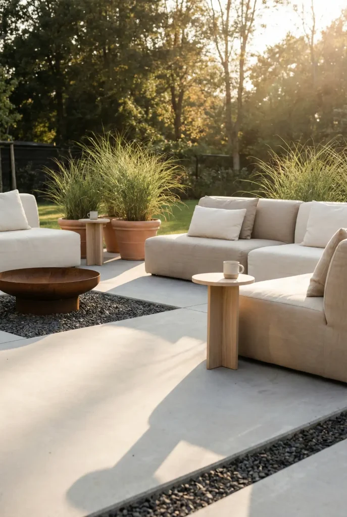 A clean-lined patio with modern furniture can make a small backyard feel surprisingly spacious. Start with a smooth concrete pad, then layer in a low sofa, two sculptural chairs, and a slim fire bowl to anchor conversation. Keep the palette calm—sand, charcoal, and warm wood—so plants and sunlight do the decorating. Add a narrow gravel border to soften the edge and improve drainage.