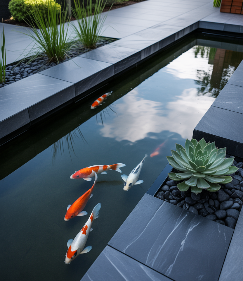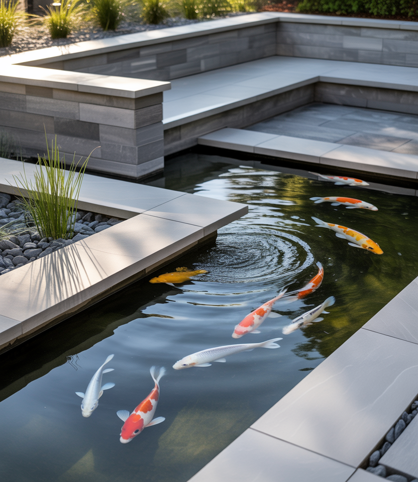 A carefully designed raised pond on the patio can become a sculptural highlight. Think stone or concrete walls, built-in bench seating, crisp design lines, and subtle lighting. This raised form works in combination with outdoor seating and entertaining, tying into patio zones. You could include small fish, maybe pair it with minimalist planting, and let the water become an immersive backdrop for outdoor living. It’s especially effective when your garden is an extension of your home’s design.