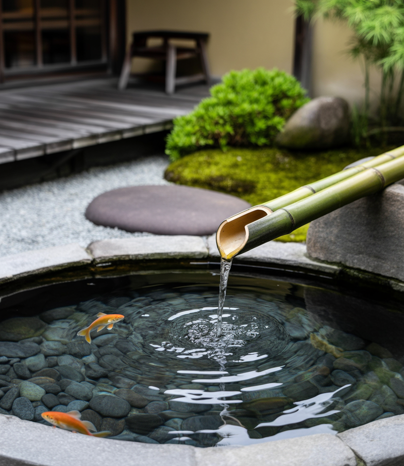 A natural Japanese-style water feature combines calmness with minimalist design. Use smooth river stones, bamboo spouts, and shallow water over gravel. Add small fish for motion and serenity. Perfect for compact courtyards or meditative garden corners where sound and reflection invite calmness after a busy day.