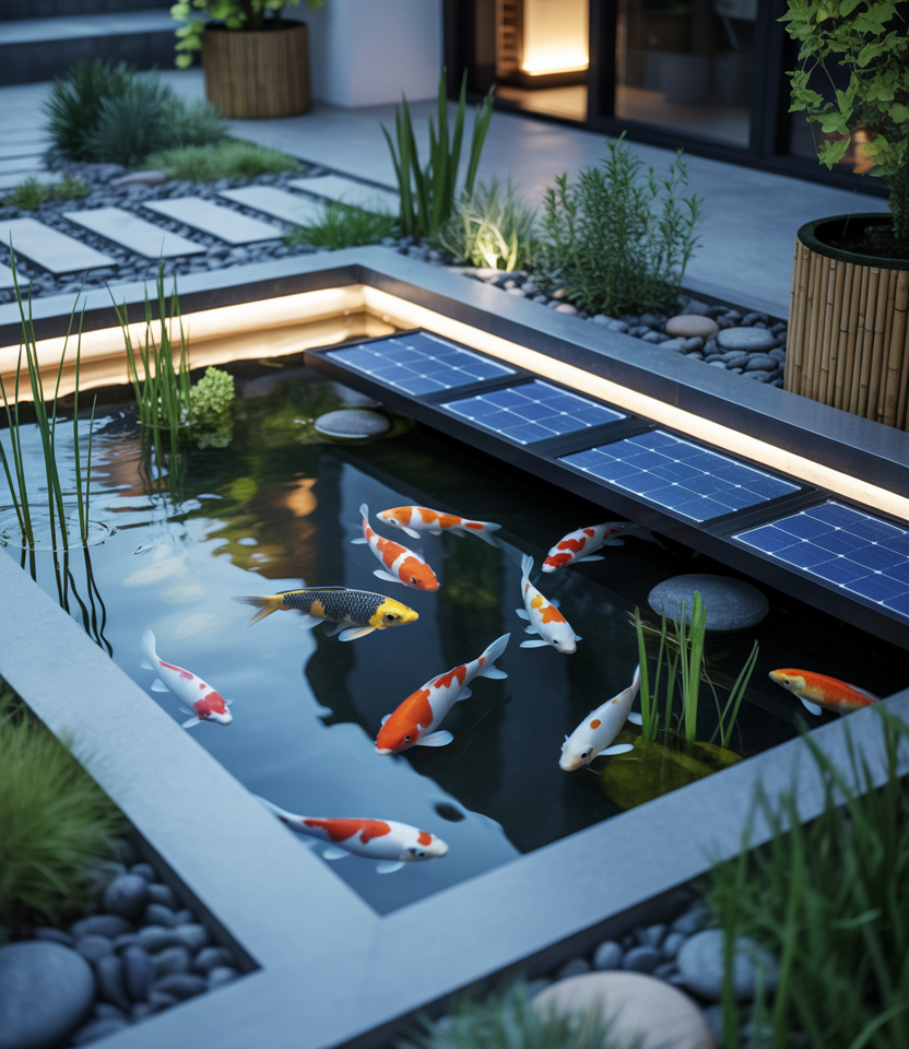 Modern outdoor ponds can shine day and night thanks to solar lighting and pumps. Floating solar panels keep water aerated for fish while subtle LEDs illuminate edges. Great for small backyard or patio settings where sustainability meets aesthetics—proof that eco-design can still be stunning.