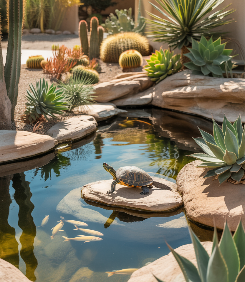 For those in warm, dry climates, a pond that mimics a natural oasis fits beautifully into desert landscaping. Frame it with succulents and gravel, keeping water shallow but cool for turtles or small fish. This style merges the raw textures of desert rock with lush aquatic contrast—an eye-catching balance.