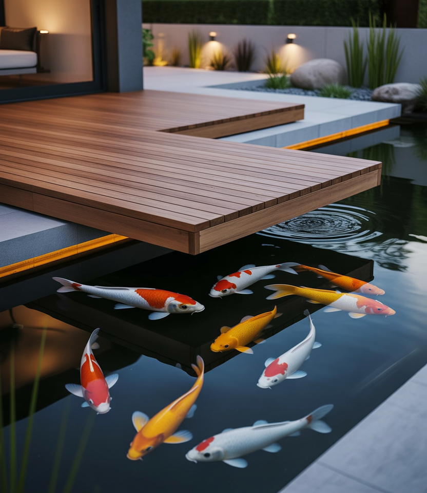 Design a floating deck above a shallow pond so that your guests literally sit above water. Beneath, graceful koi, or garden fish, move in calm rhythm. It’s a sophisticated solution for backyard parties, pairing modern architecture with the soothing sound of water. Add subtle lights for evening glow.